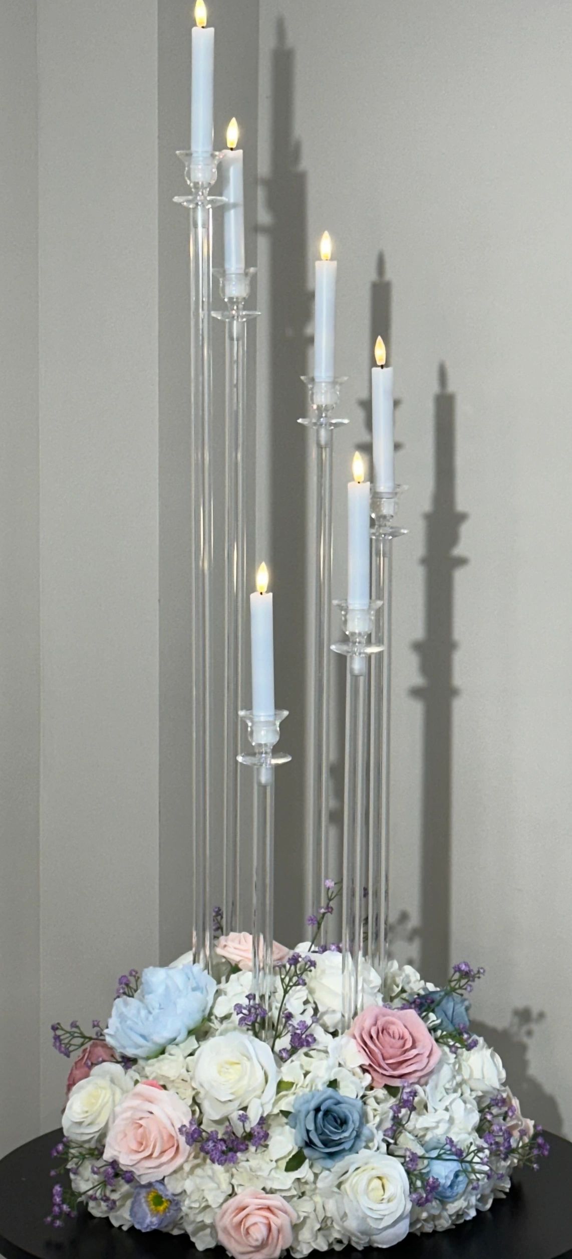 Six arm acrylic candelabra. LED candles included.