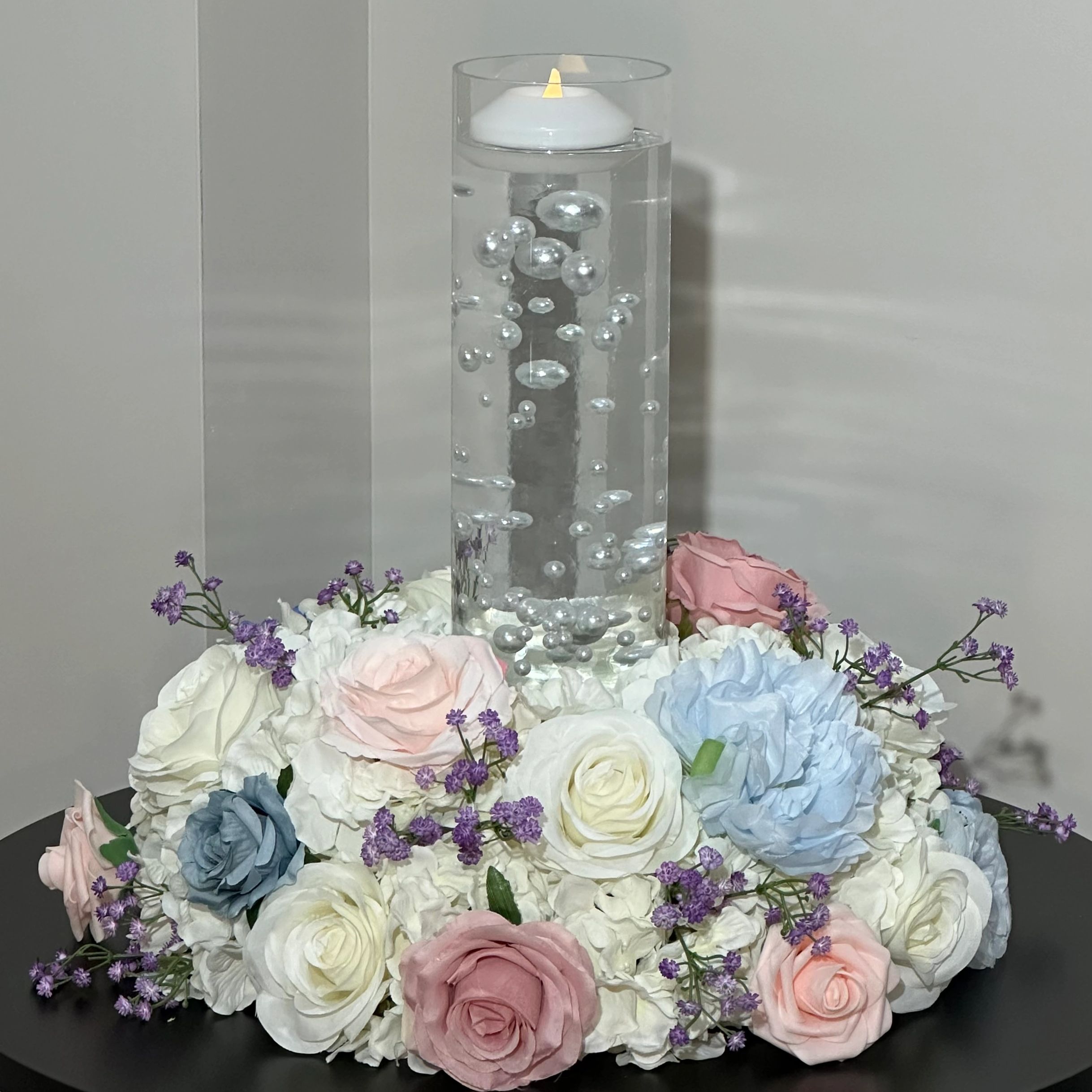 Wreath with a floating candle and pearls.